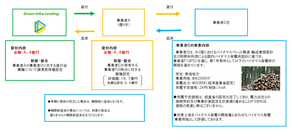 事業者Aは、再生可能エネルギー事業開発事業者Cに対して、東海地方におけるバイオマス発電所の開発について用地確保のための土地取得代金として4.4億円の融資を行います。