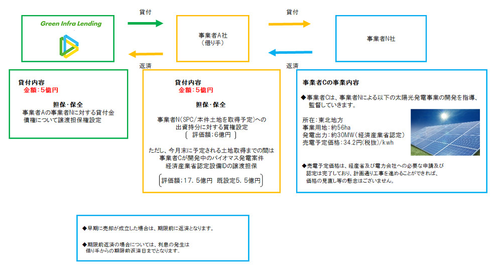 事業者Cは、事業者N(SPC)を通じ、東北地方における太陽光発電所の開発を進めており、本件開発案件を事業者・ファンド、投資家等に販売し、販売後の売却代金を原資に返済がおこなわれます。