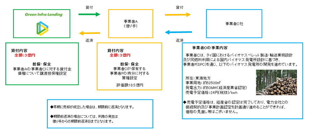 事業者Aは、再生可能エネルギー事業開発事業者Cに対して、東海地方におけるバイオマス発電事業開発のための測量、地元調整、土地確保等の支出に対応するための資金として、3億円の融資を行います。