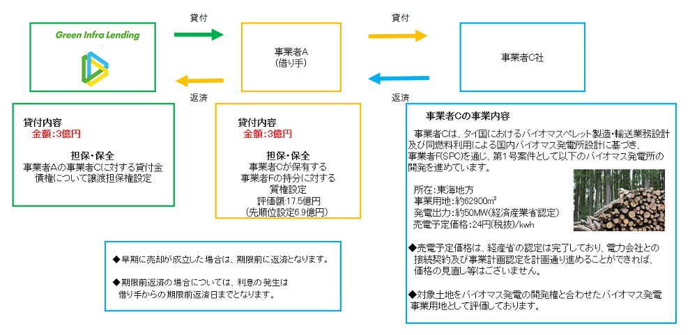 事業者Cは、上記バイオマス発電事業に係る設計に基づき、事業者F(SPC)を通じ、第1号案件として東海地方におけるバイオマス発電所の開発を進めており、本件開発案件を当該発電所の建設・運営を目的として新たに設立する予定の事業主体に販売することにより、販売後の売却代金を原資に返済がおこなわれます。